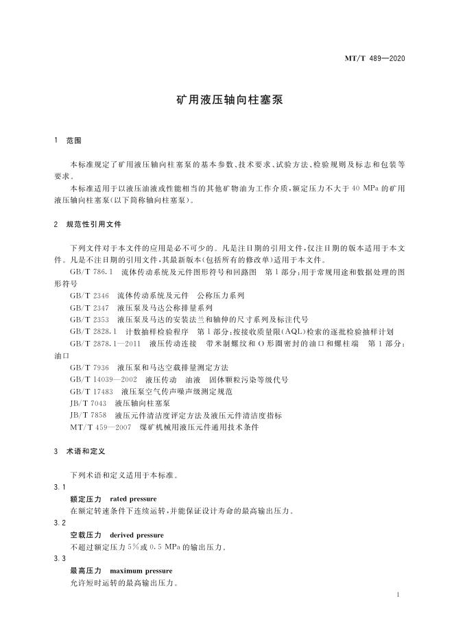 MT/T 489-2020 矿用液压轴向柱塞泵