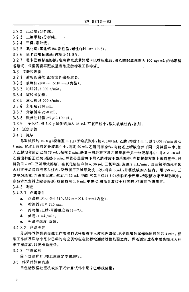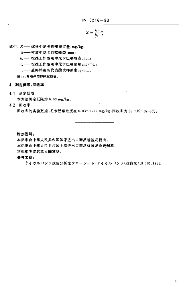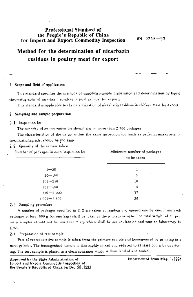 SN 0216-1993 出口禽肉中尼卡巴嗪残留量检验方法