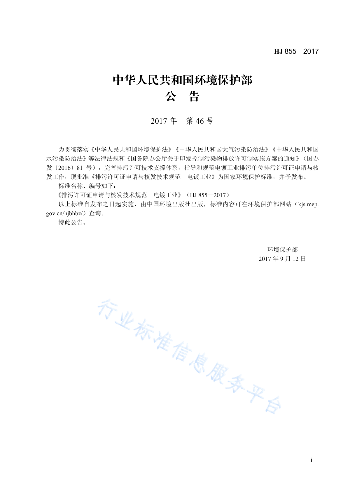 HJ 855-2017 排污许可证申请与核发技术规范 电镀工业