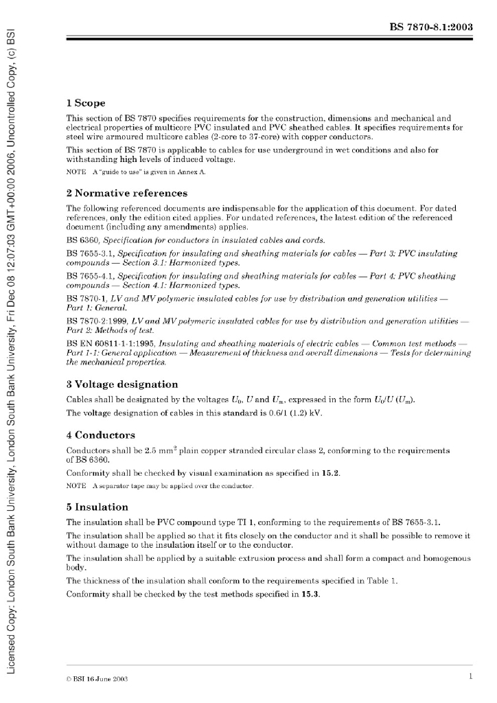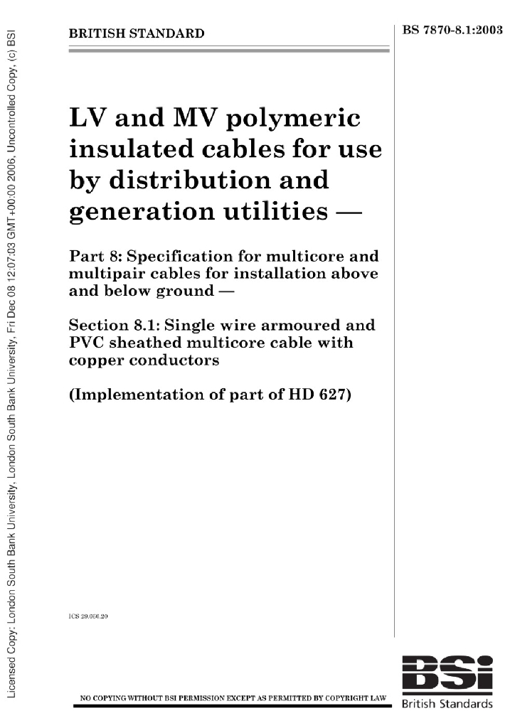 BS 7870-8.1:2003 用于配电和发电设备的低压和中压聚合物绝缘电缆 多核和多股电缆地上和地下安装规范 铜芯单线铠装聚氯乙烯护套多芯电缆 第8.1节铜芯单线铠装聚氯乙烯护套多芯电缆