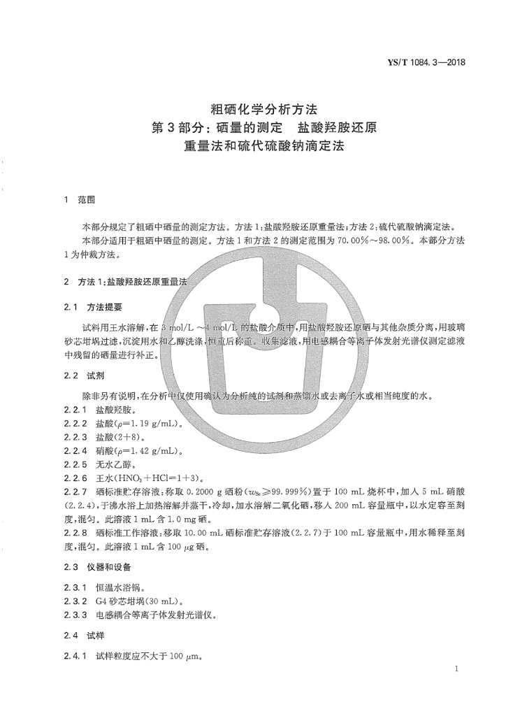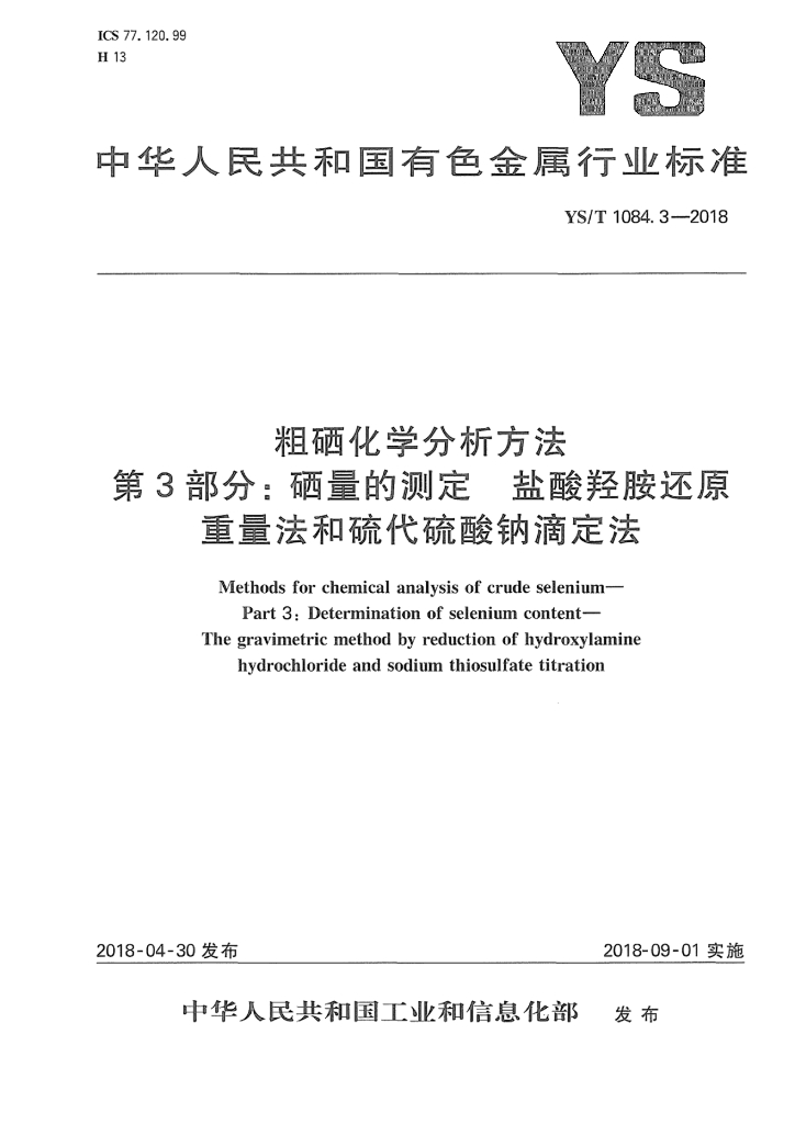 YS/T 1084.3-2018 粗硒化学分析方法 第3部分:硒量的测定 盐酸羟胺还原重量法和硫代硫酸钠滴定法