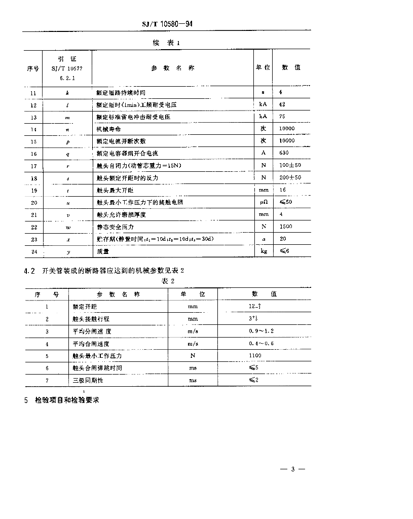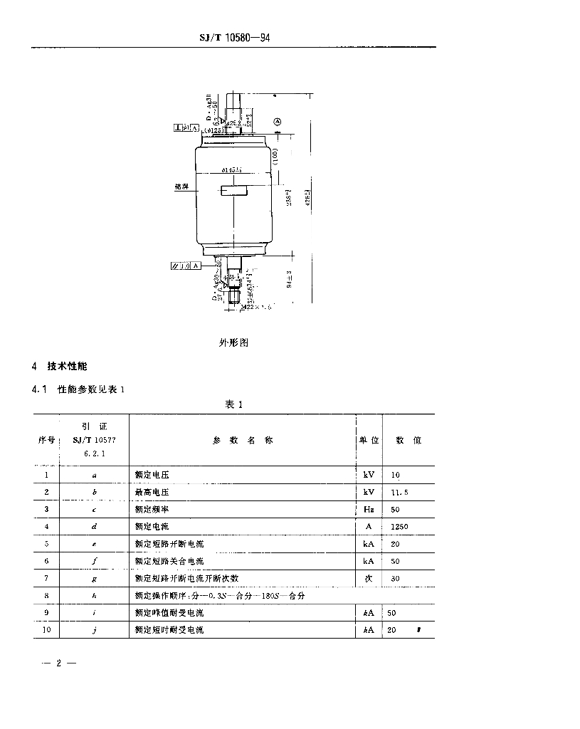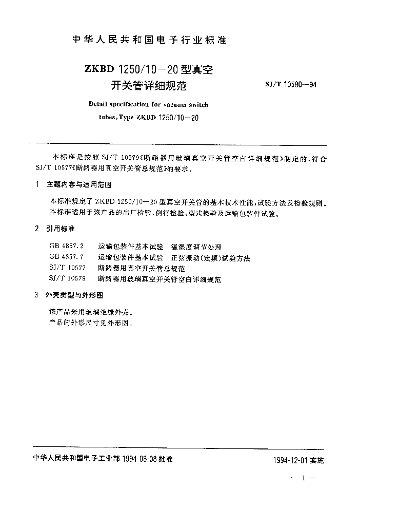 SJ/T 10580-1994 ZKBD1250/10-20型真空开关管详细规范