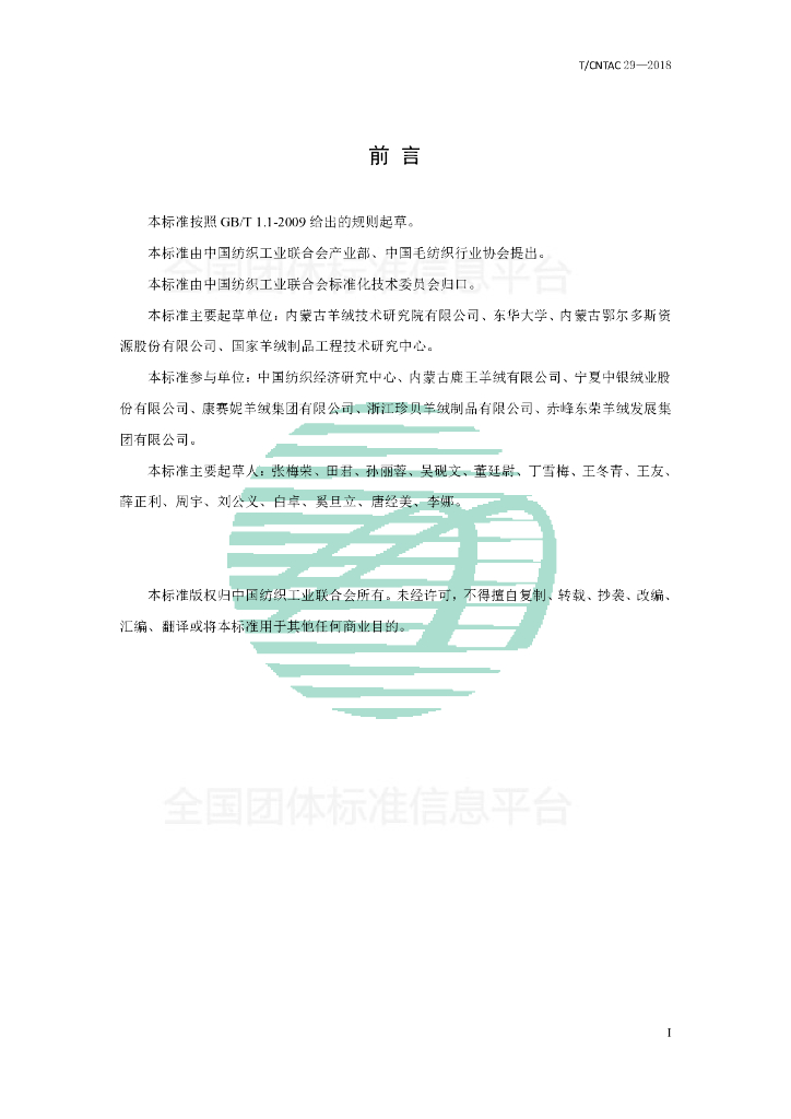 内蒙古羊绒技术研究院有限公司、东华大学、内蒙古鄂尔多斯资源股份有限公司、国家羊绒制品工程技术研究中心、中国纺织经济研究中心、内蒙古鹿王羊绒有限公司、宁夏中银绒业股份有限公司、康赛妮羊绒集团有限公司、浙江珍贝羊绒制品有限公司、赤峰东荣羊绒发展集团有限公司