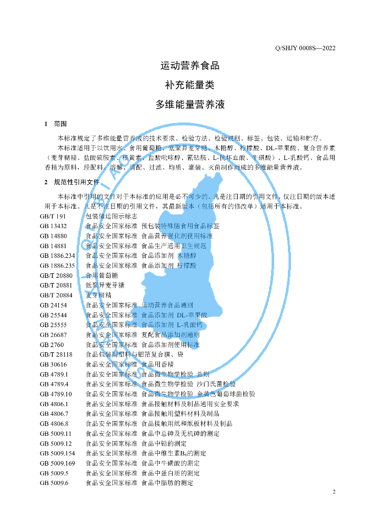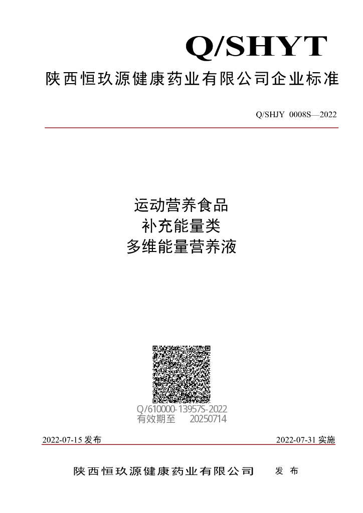 Q/SHJY 0008S-2022 运动营养食品 补充能量类 多维能量营养液