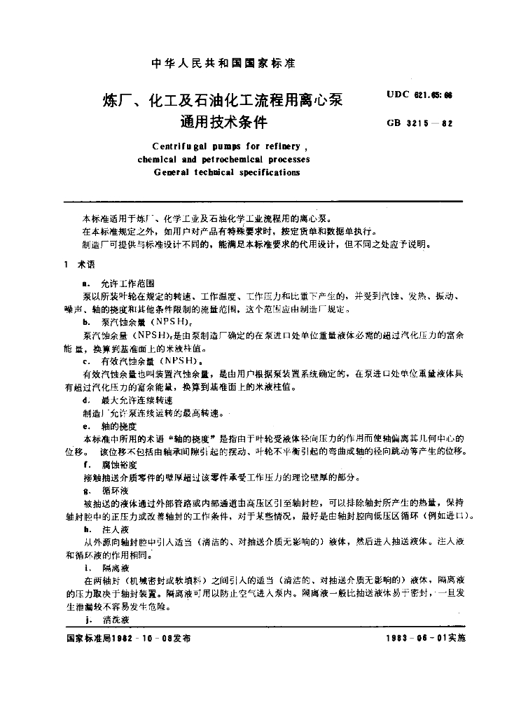 GB/T 3215-1982 炼厂、化工及石油化工流程用离心泵通用技术条件