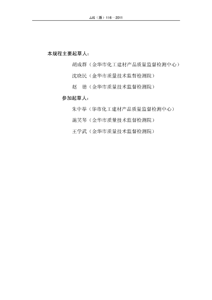 胡成群(金华市化工建材产品质量监督检测中心)、沈晓民(金华市质量技术监督检测院)、赵德(金华市质量技术监督检测院)、朱中举(华市化工建材产品质量监督检测中心)、施笑琴(金华市质量技术监督检测院)、王学武(金华市质量技术监督检测院)
