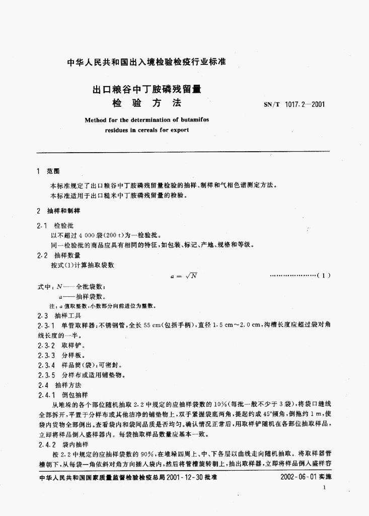 SN/T 1017.2-2001 出口粮谷中丁胺磷残留量检验方法