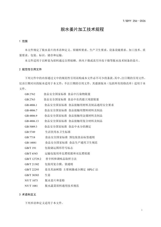 T/SDYY 256-2026 脱水姜片加工技术规程