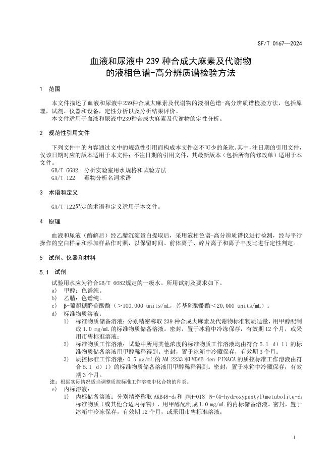 SF/T 0167-2024 血液和尿液中239种合成大麻素及代谢物的液相色谱-高分辨质谱检验方法