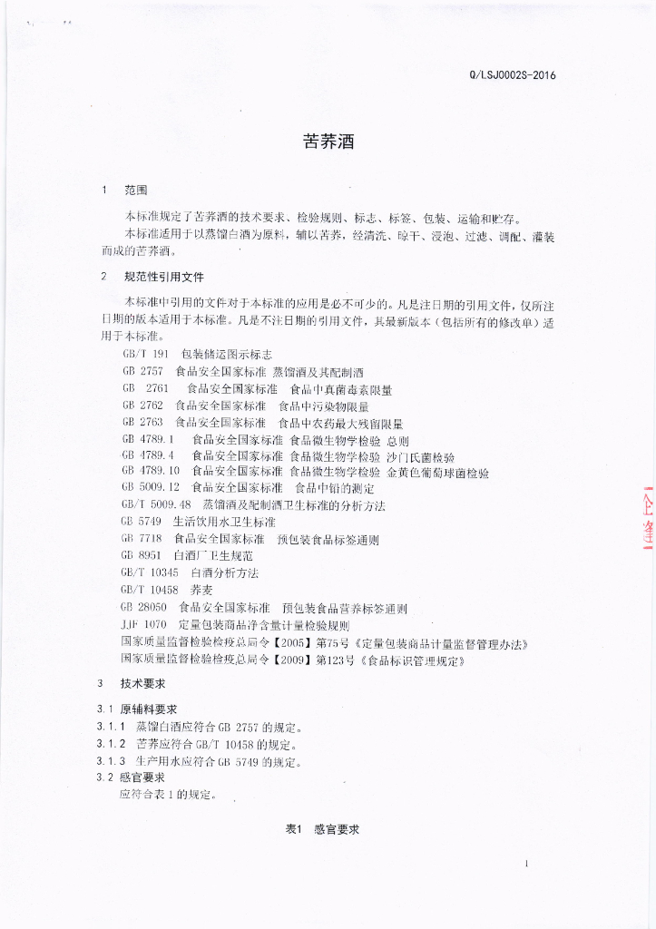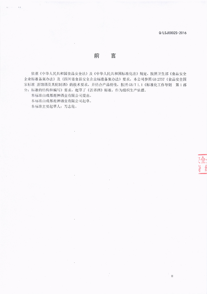 Q/LSJ 0002S-2016 成都鹿神酒业有限公司 苦荞酒