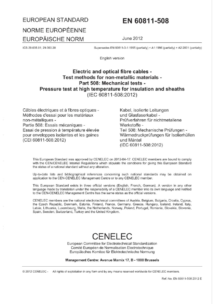 EN 60811-508-2012 电缆和光缆.非金属材料试验方法 第508部分:机械试验