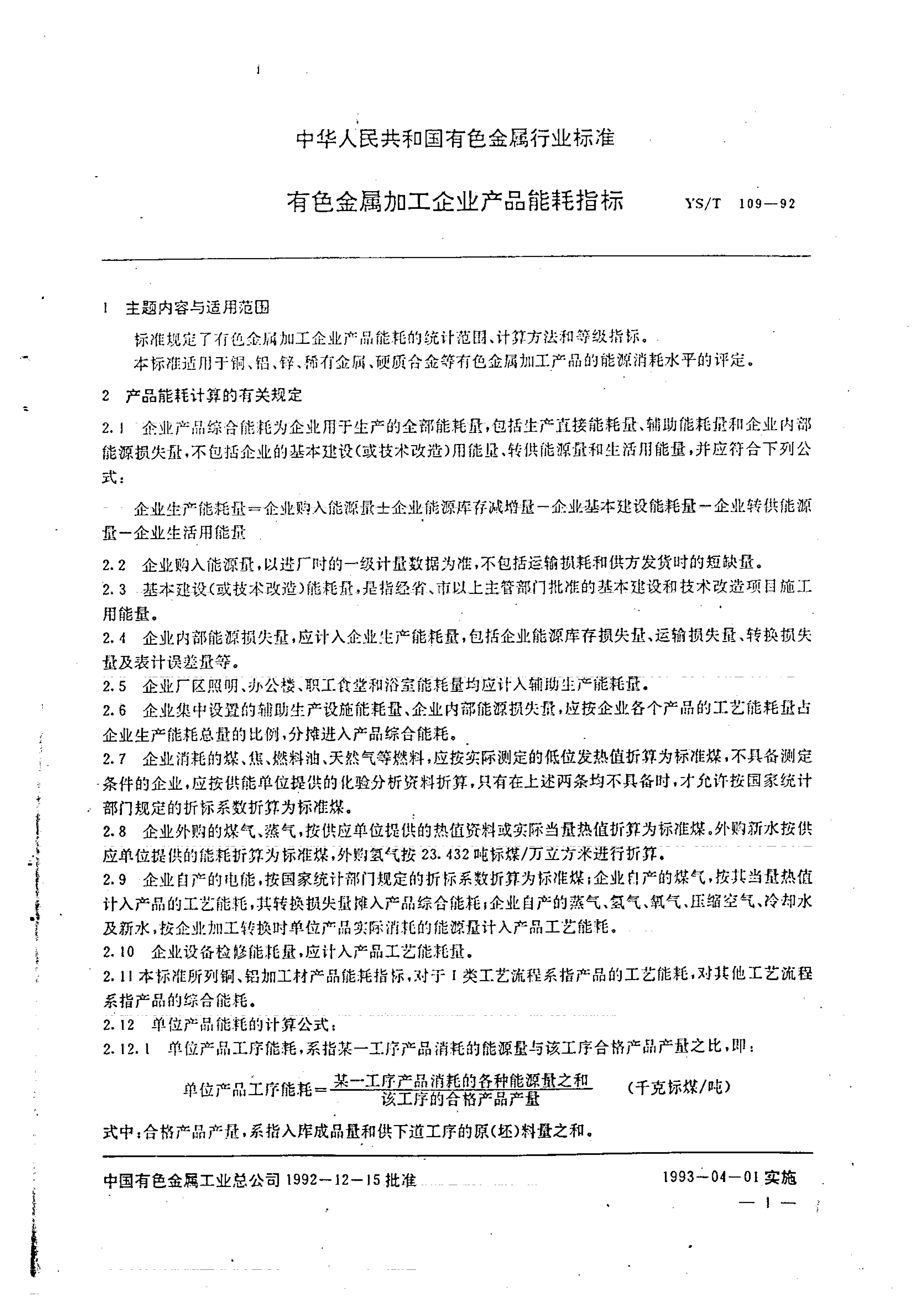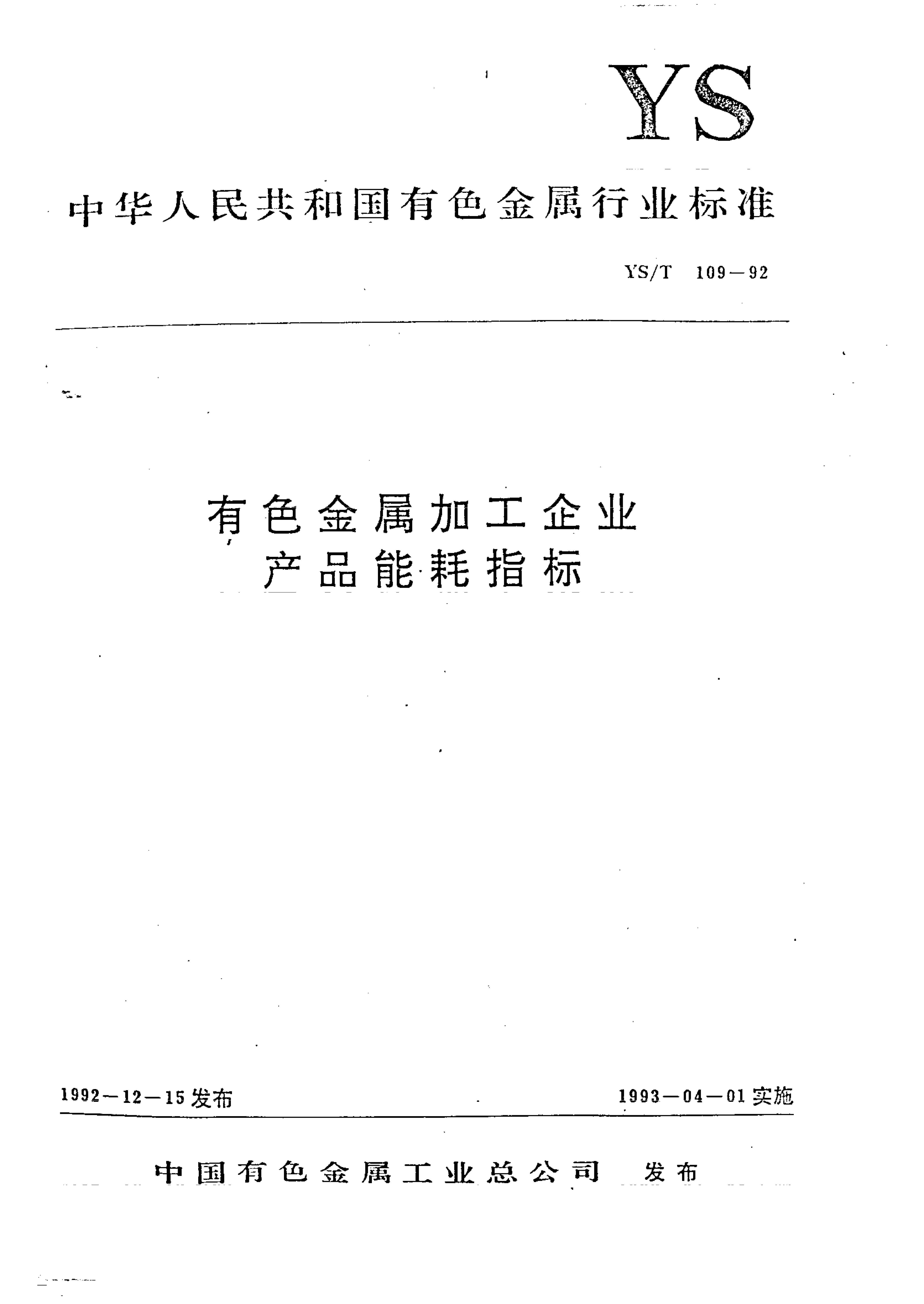 YS/T 109-1992 有色金属加工企业产品能耗指标