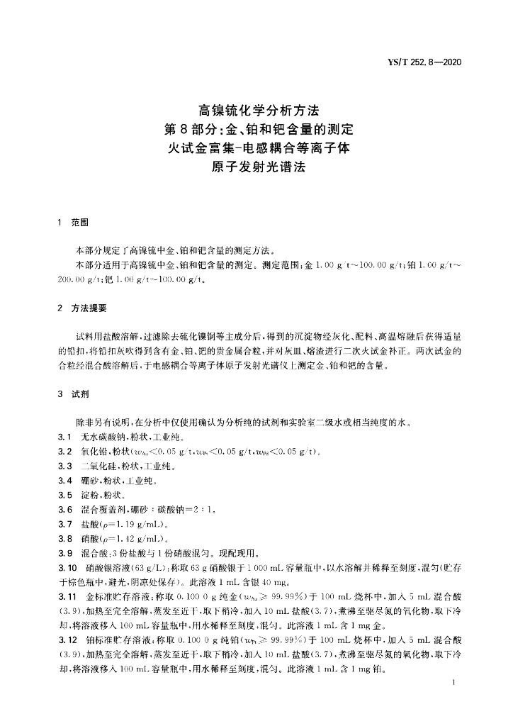 YS/T 252.8-2020 高镍锍化学分析方法 第8部分:金、铂和钯含量的测定 火试金富集-电感耦合等离子体原子发射光谱法