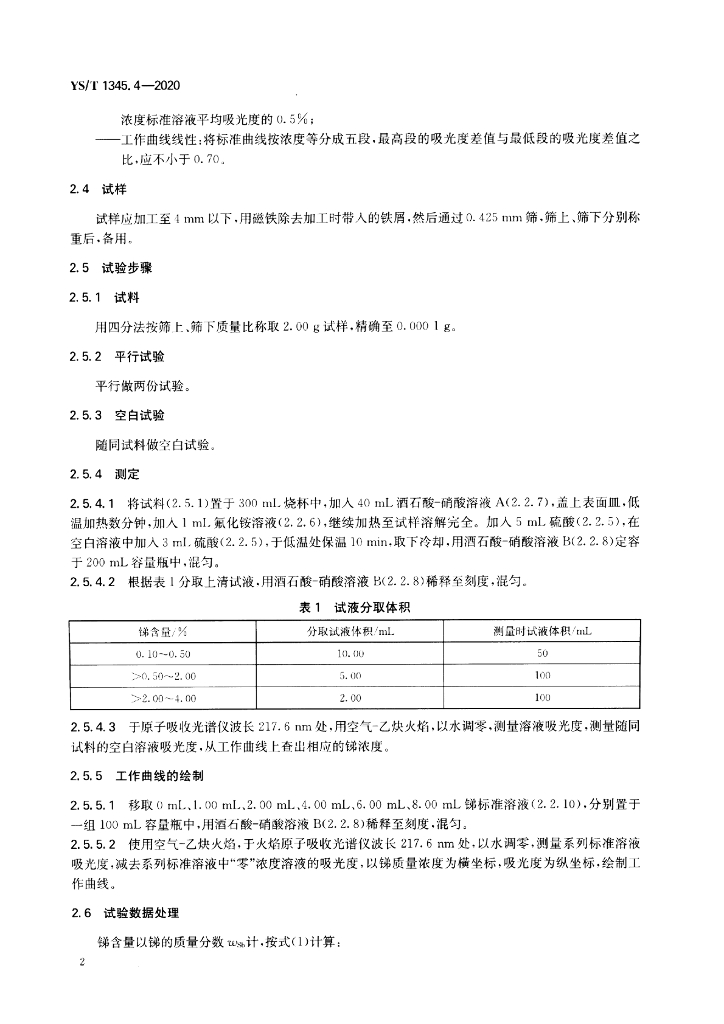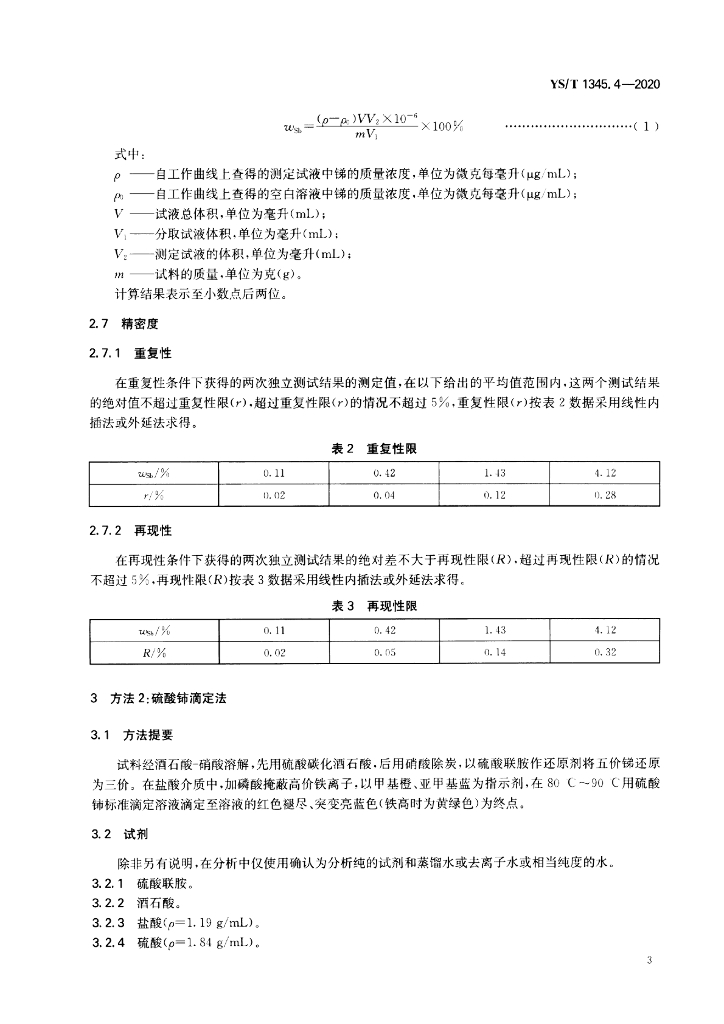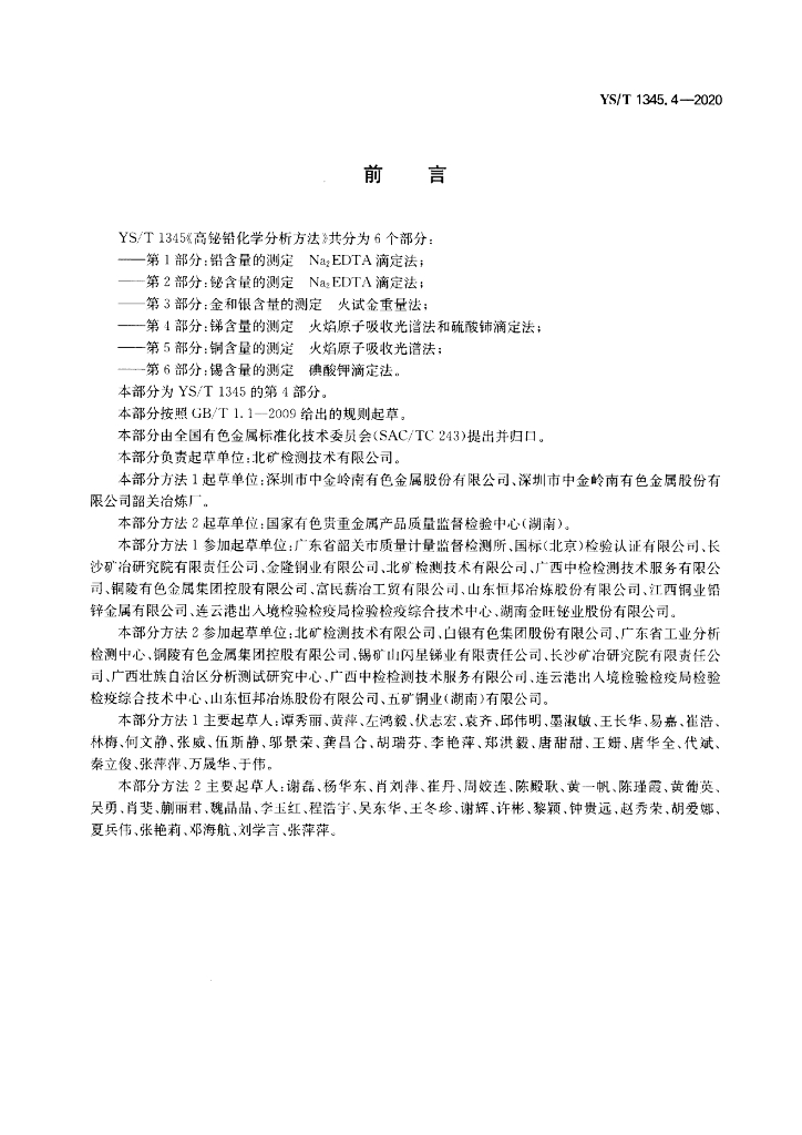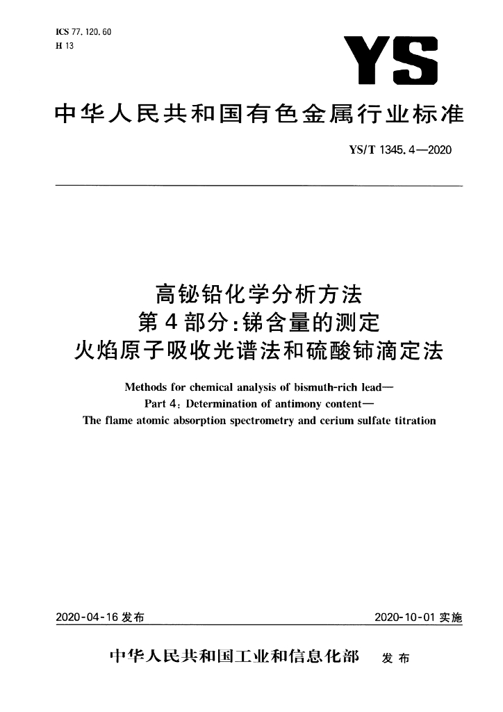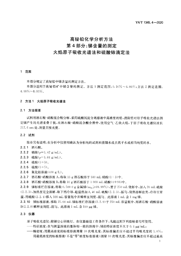 YS/T 1345.4-2020 高铋铅化学分析方法 第4部分:锑含量的测定 火焰原子吸收光谱法和硫酸铈滴定法