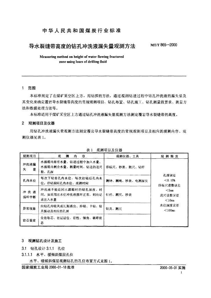MT/T 865-2000 导水裂缝带高度的钻孔冲洗液漏失量观测方法