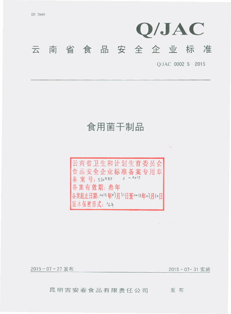 Q/JAC 0002S-2015 昆明吉安春食品有限责任公司 食用菌干制品