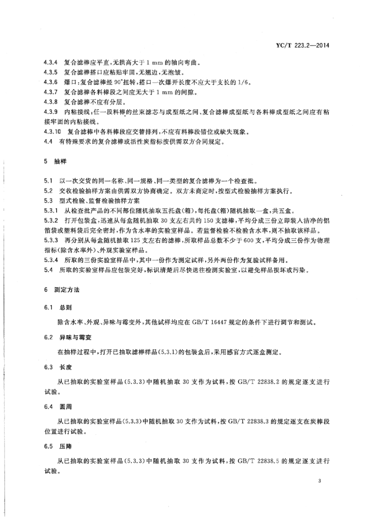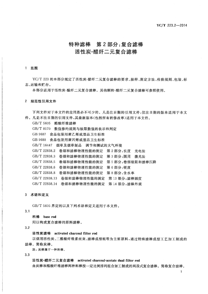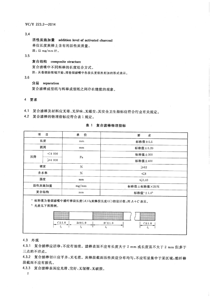 YC/T 223.2-2014 特种滤棒 第2部分:复合滤棒活性炭-醋纤二元复合滤棒