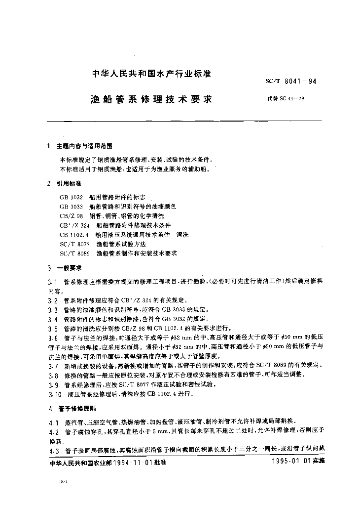 SC/T 8041-1994 渔船管系修理技术要求