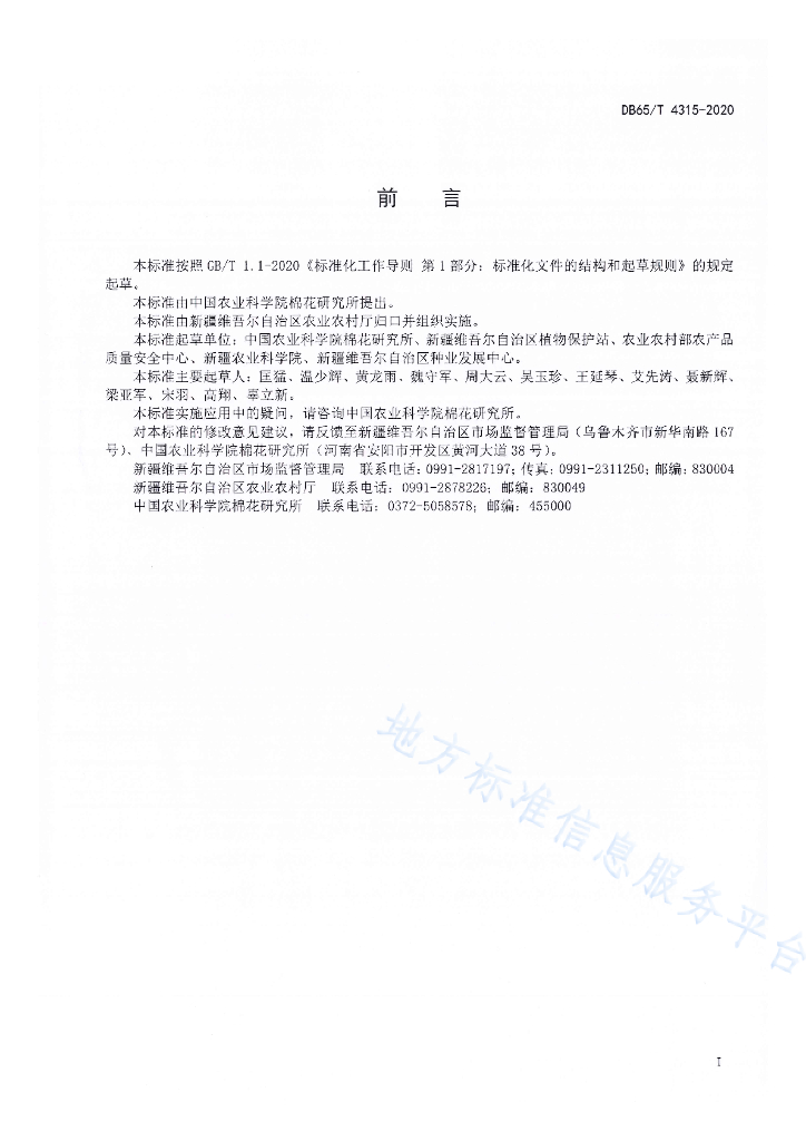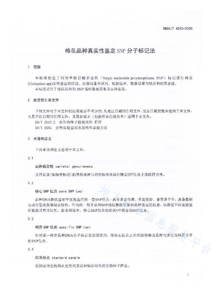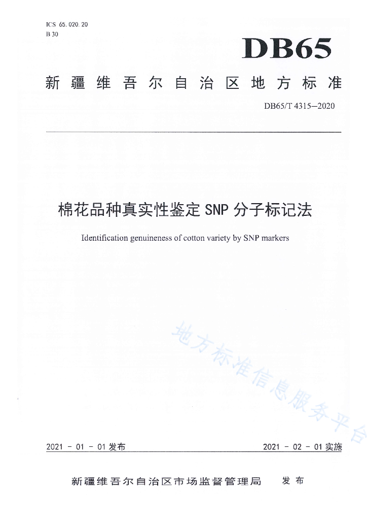 DB65/T 4315-2020 棉花品种真实性鉴定SNP分子标记法
