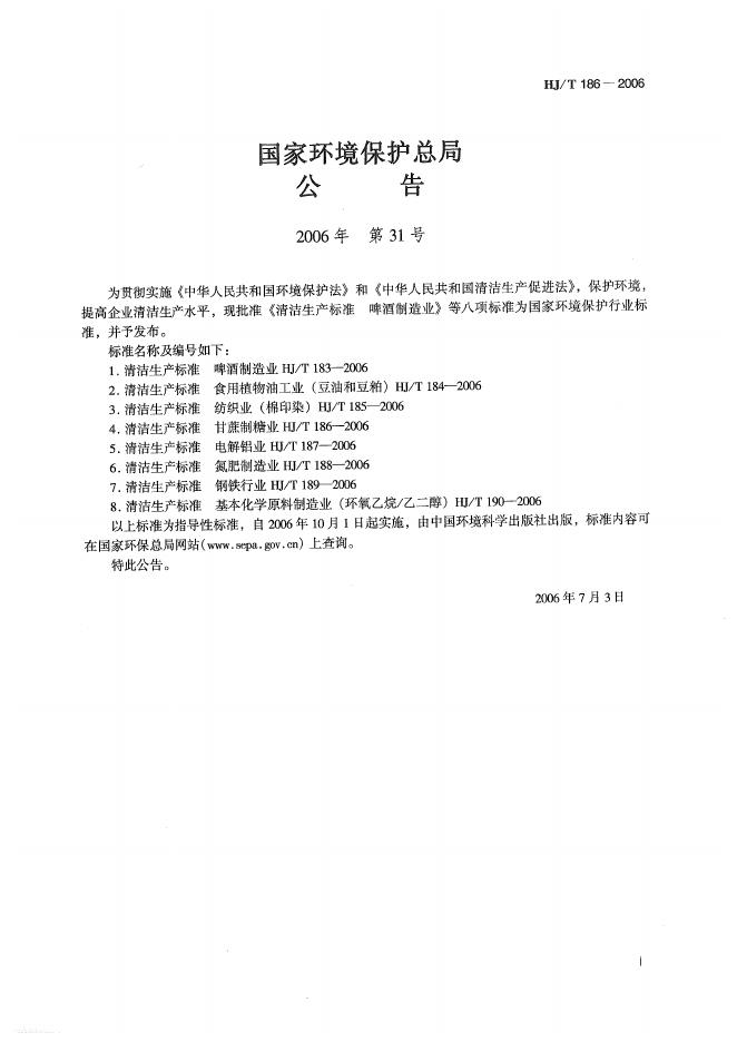 HJ/T 186-2006 清洁生产标准 甘蔗制糖业