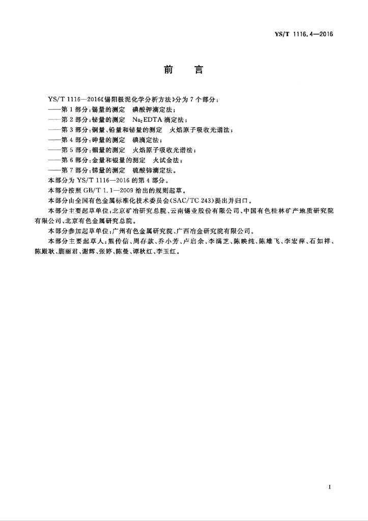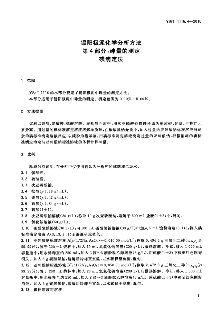 YS/T 1116.4-2016 锡阳极泥化学分析方法 第4部分:砷量的测定 碘滴定法