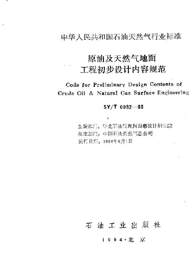 SY/T 0082-1993 原油及天然气地面工程初步设计内容规范