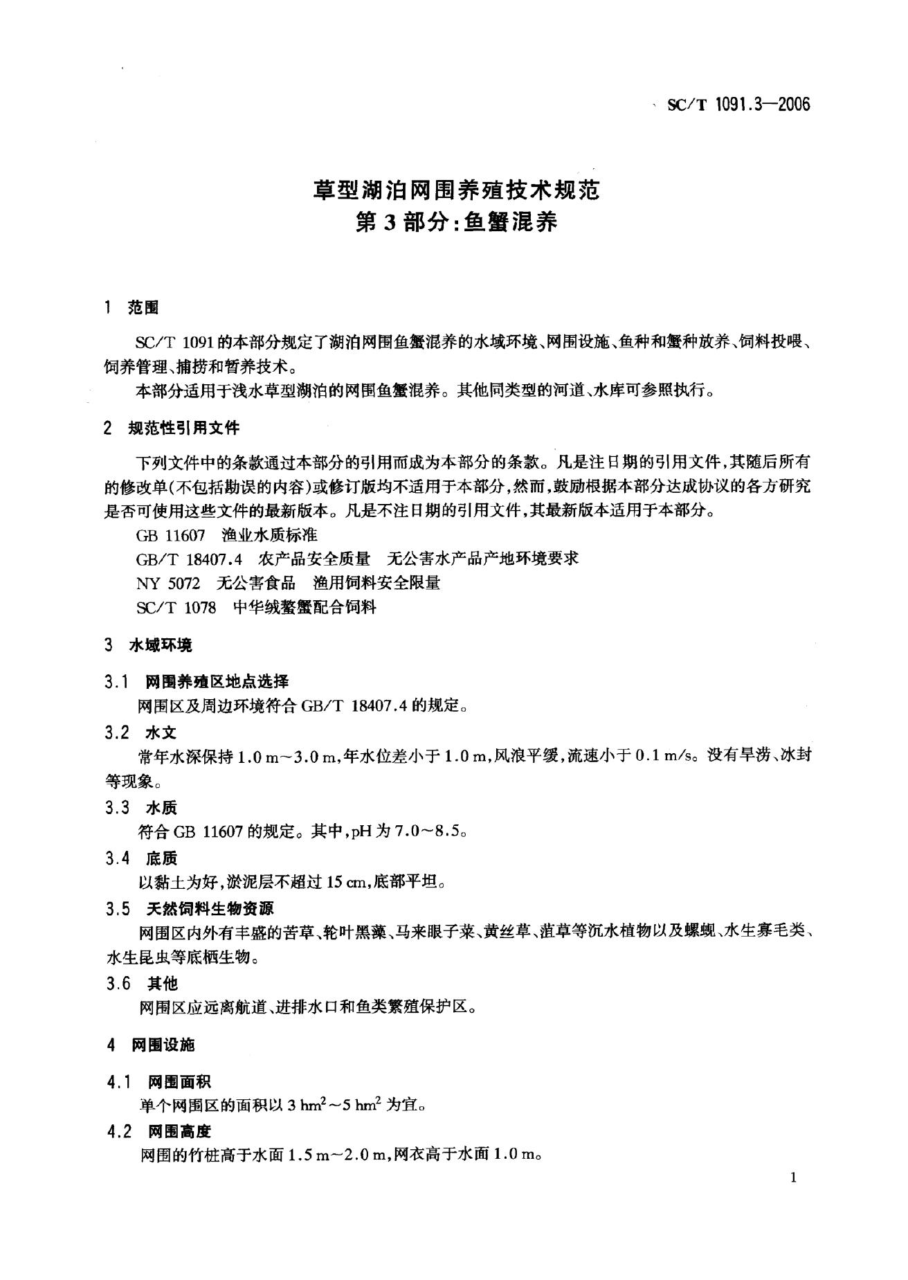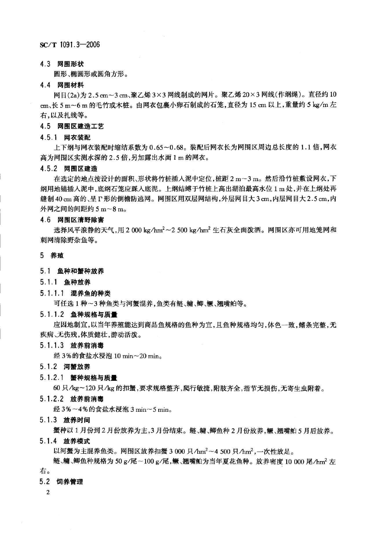 SC/T 1091.3-2006 草型湖泊网围养殖技术规范 第3部分:鱼蟹混养