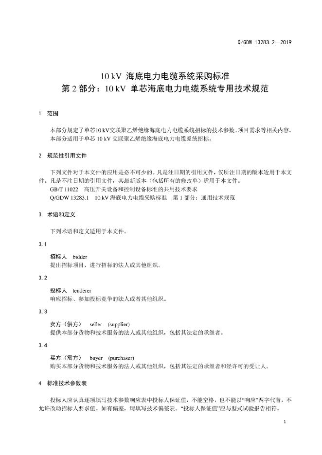 Q/GDW 13283.2-2019 10kV海底电力电缆系统采购标准 第2部分:10kV单芯海底电力电缆系统专用技术规范