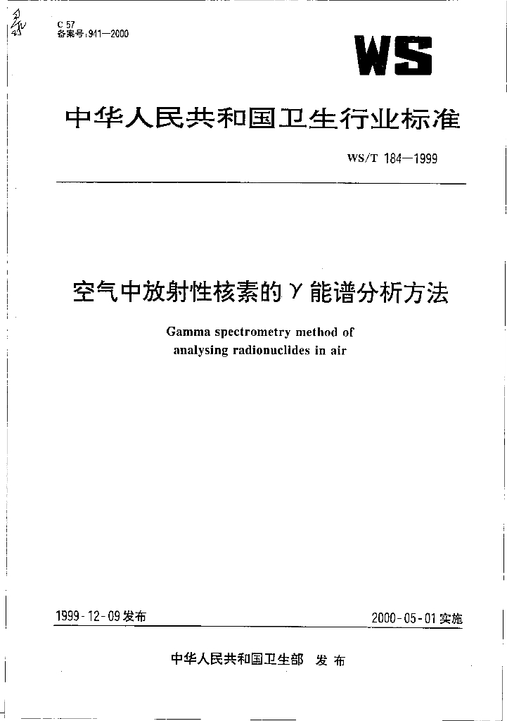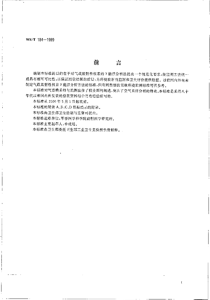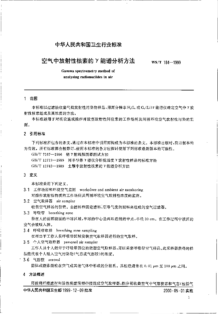 WS/T 184-1999 空气中放射性核素的γ能谱分析方法