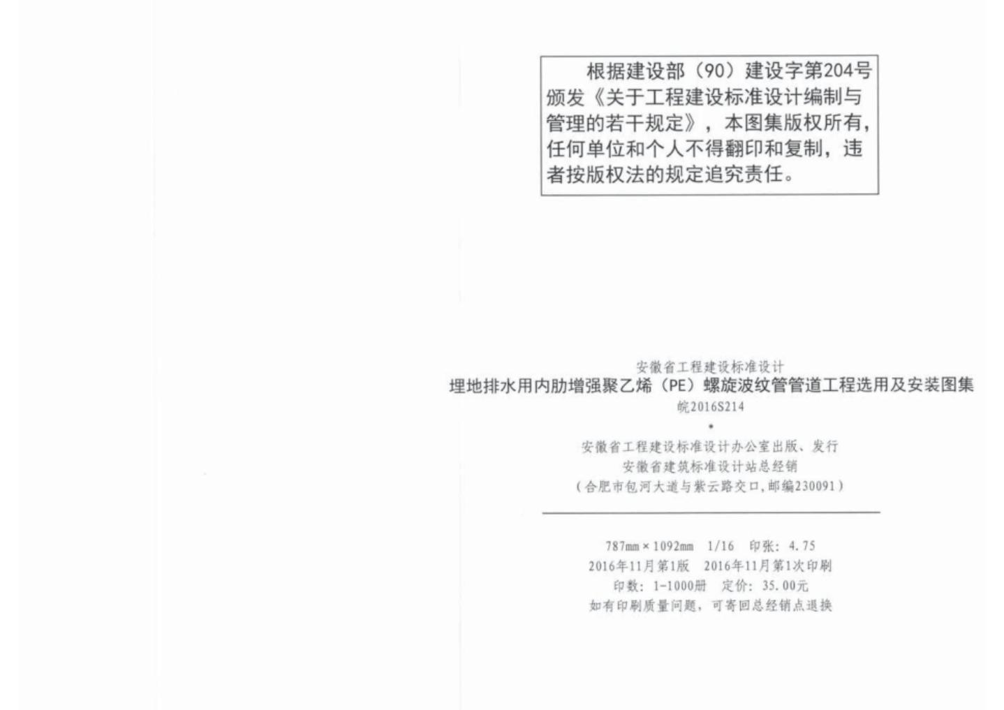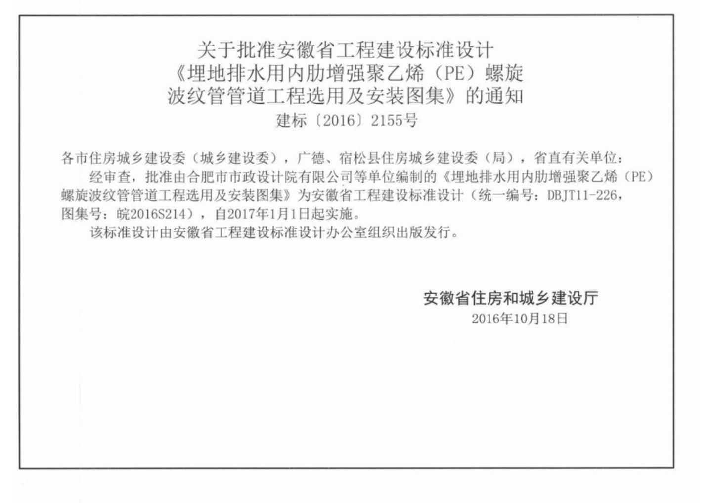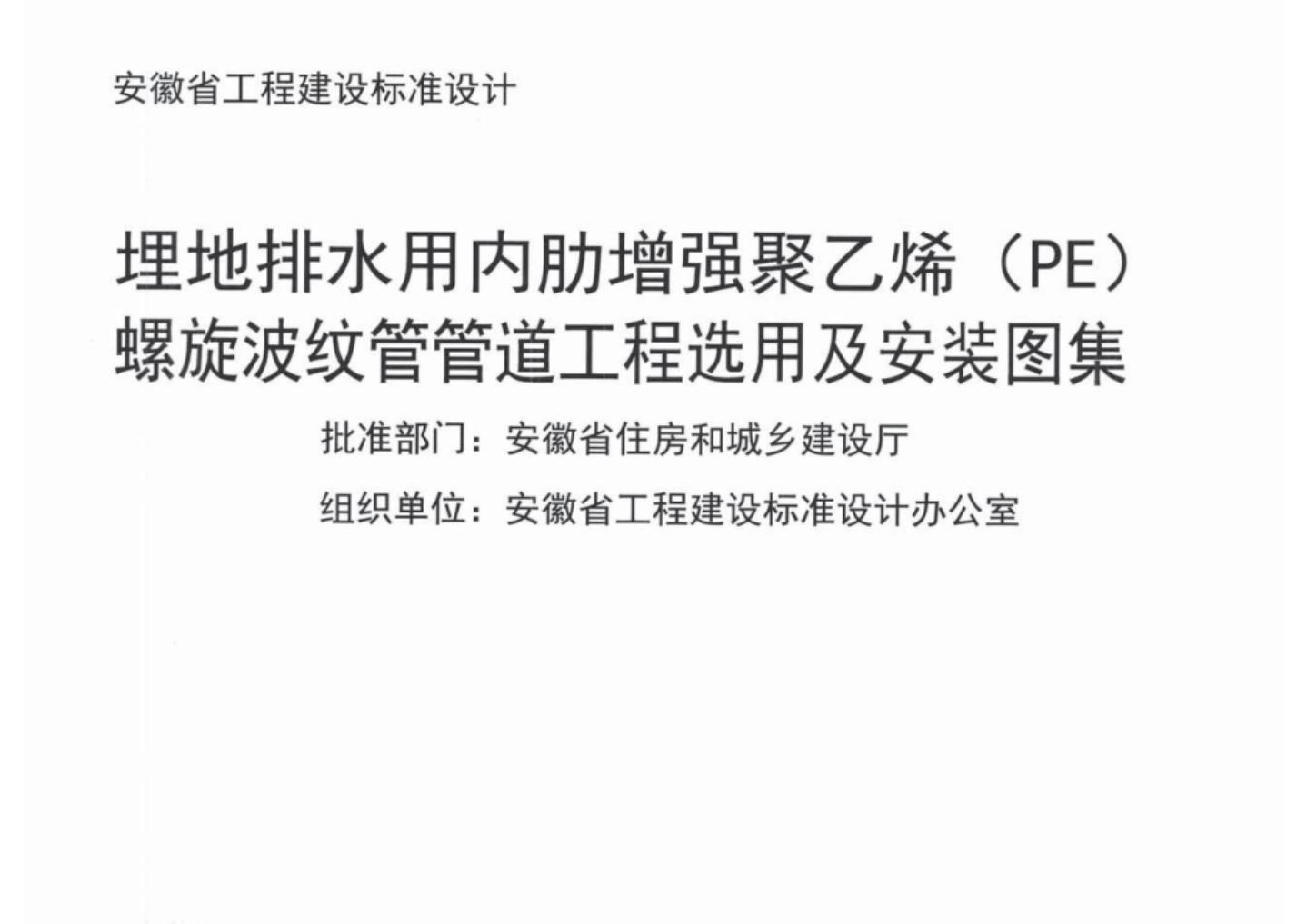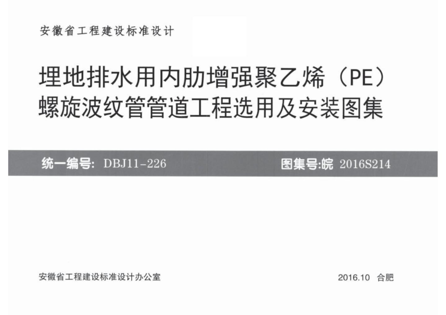 皖2016S214 埋地排水用内肋增强聚乙烯(PE)螺旋波纹管管道工程选用及安装图集(DBJT11-226)