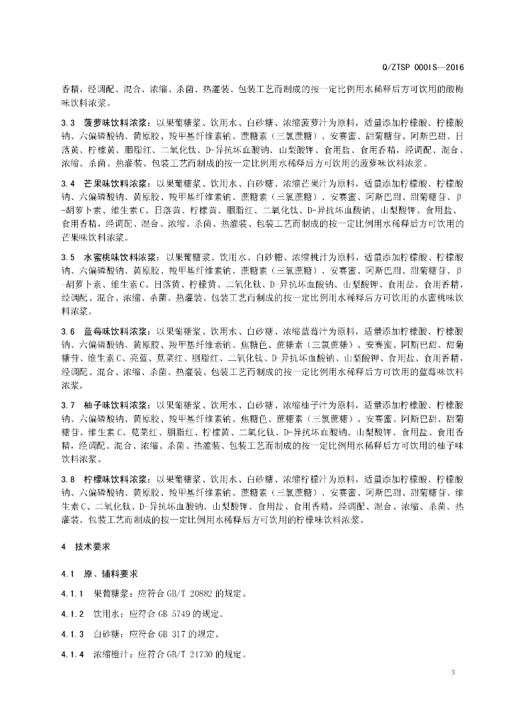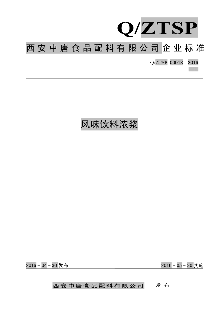 Q/ZTSP 0001S-2016 西安中唐食品配料有限公司 风味饮料浓浆