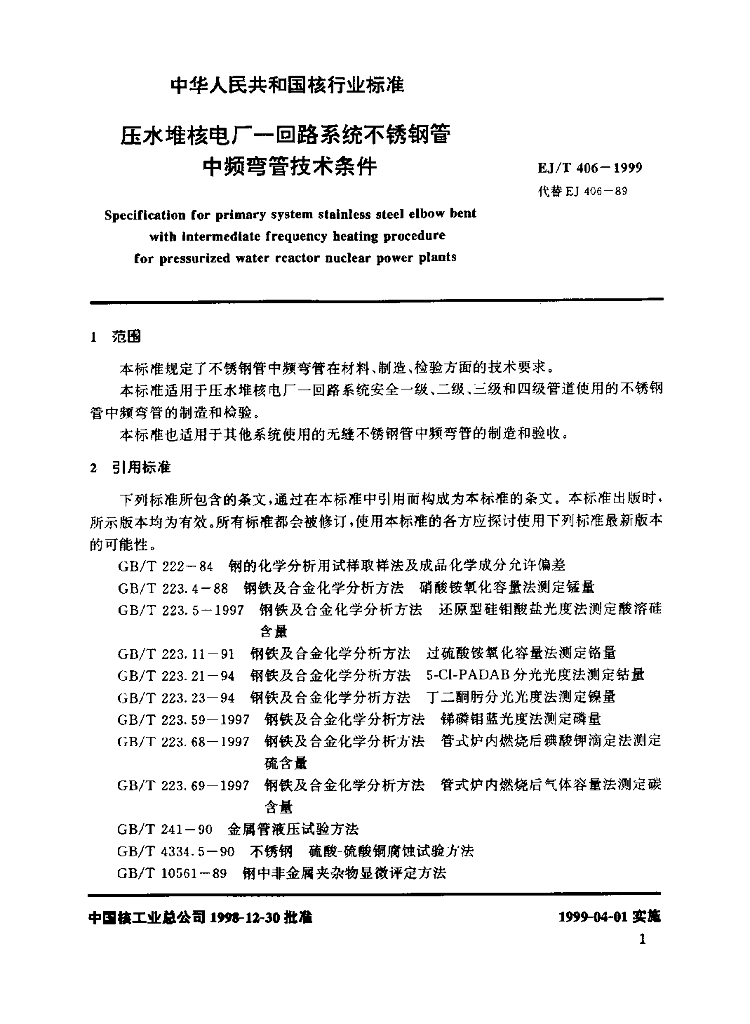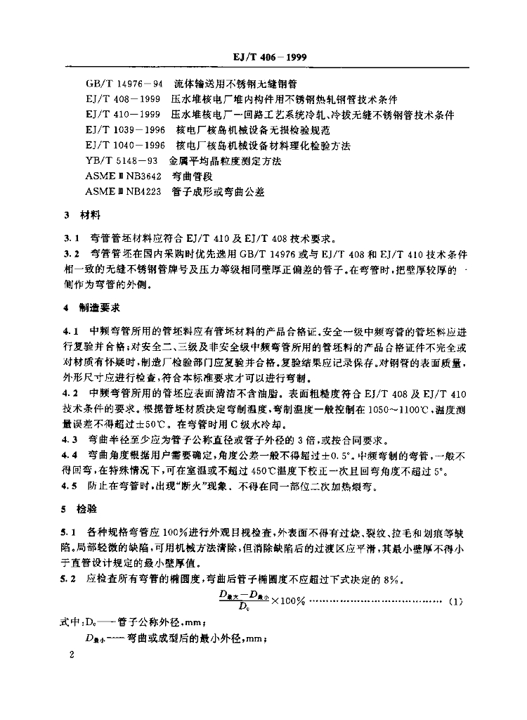EJ/T 406-1999 压水堆核电厂-回路系统不锈钢管中频弯管技术条件