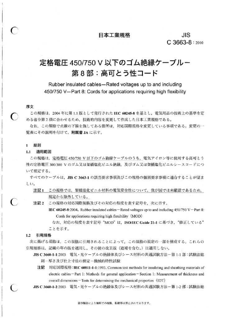 JIS C3663-8:2010 固定电压450/750V以下的橡胶绝缘电缆 第8部分 高变电缆