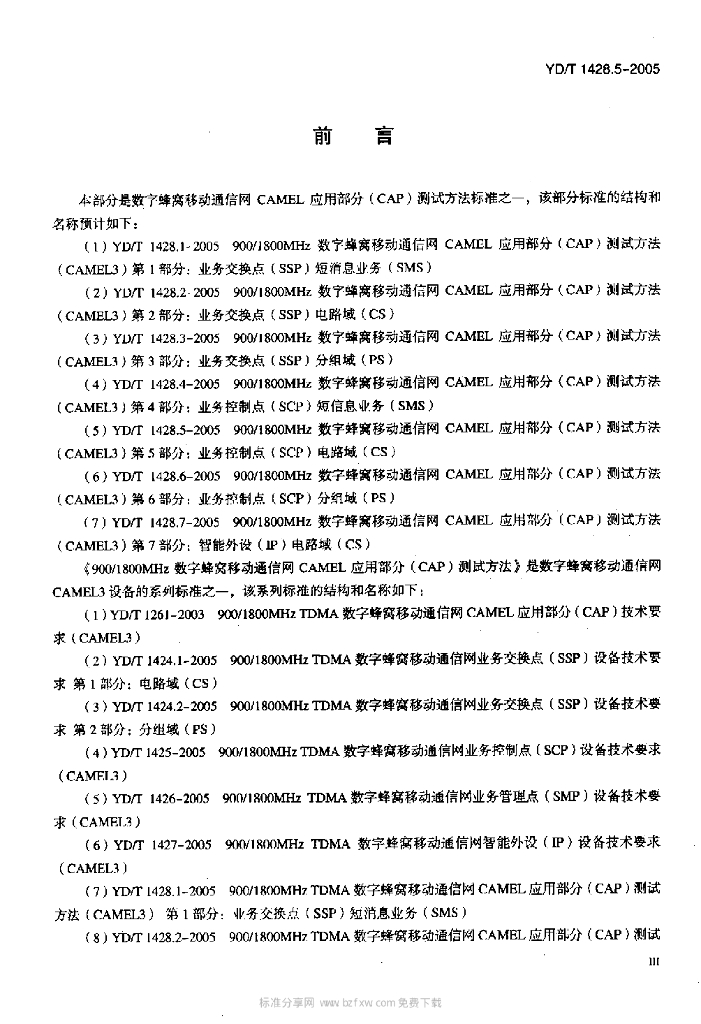 YD/T 1428.5-2005 900/1800MHz TDMA 数字蜂窝移动通信网CAMEL应用部分(CAP)测试方法(CAMEL3) 第5部分:业务控制点(SCP)电路域(CS)