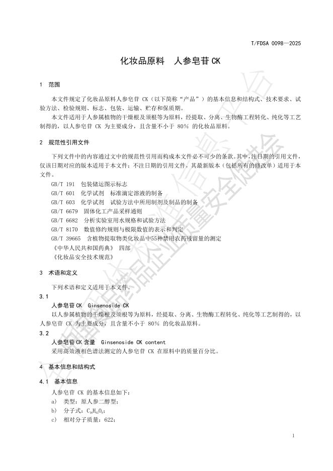 T/FDSA 0098-2025 化妆品原料 人参皂苷CK