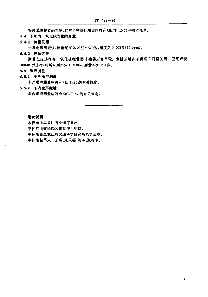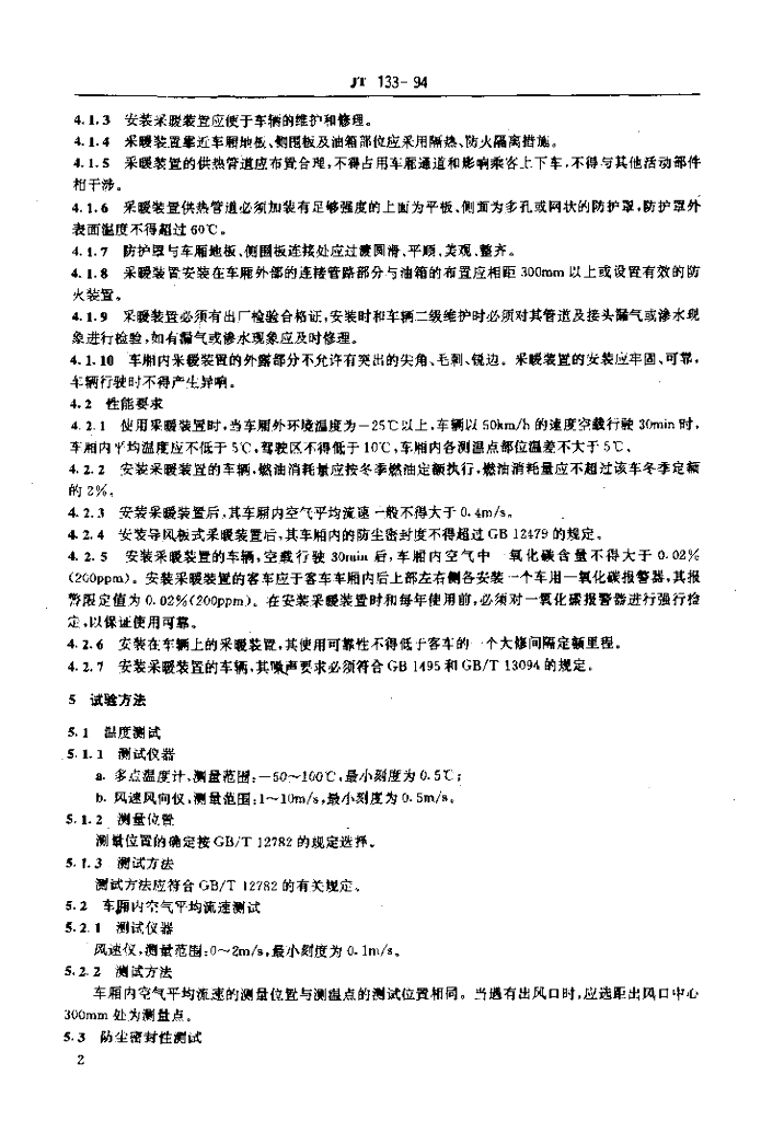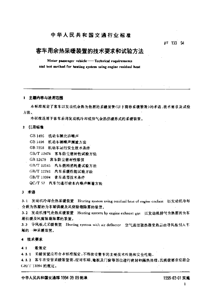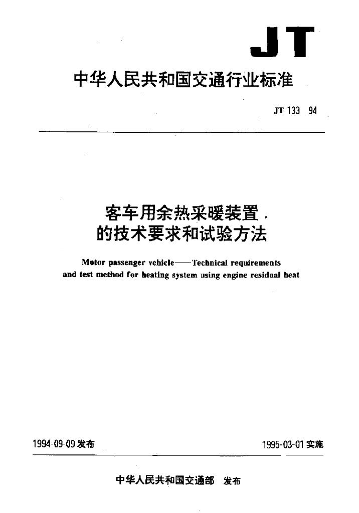 JT 133-1994 客车用余热采暖装置的技术要求和试验方法