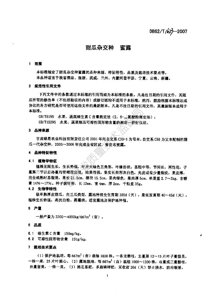 DB62/T 1623-2007 农作物品种 甜瓜杂交种 蜜露