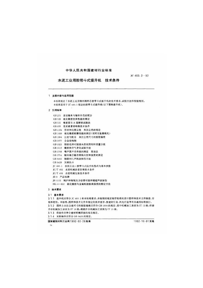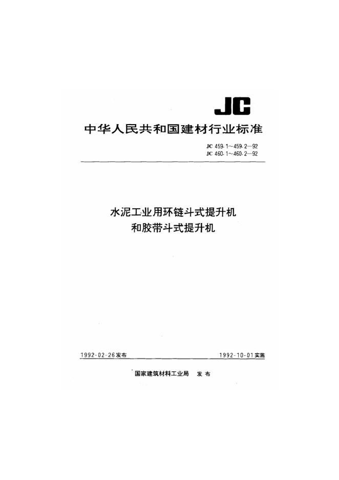 JC 460.2-1992 水泥工业用胶带斗式提升机技术条件