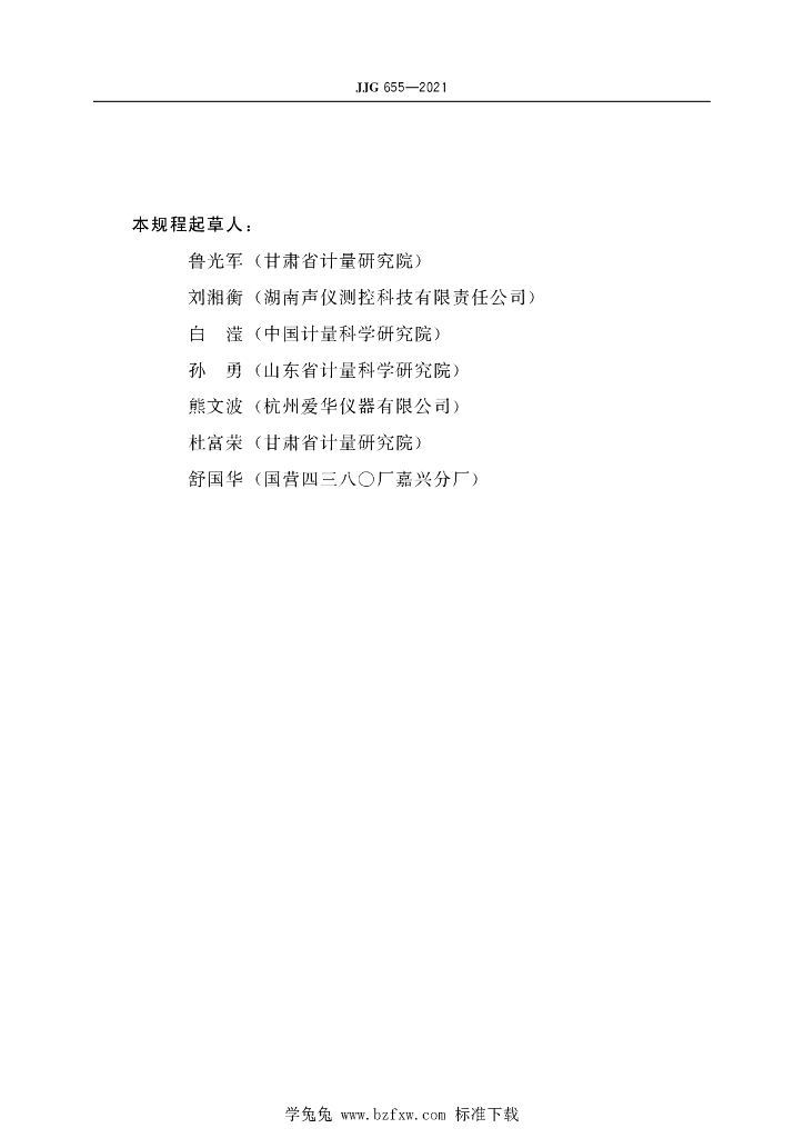 鲁光军(甘肃省计量研究院)、刘湘衡(湖南声仪测控科技有限责任公司)、白滢(中国计量科学研究院)、孙勇(山东省计量科学研究院)、熊文波(杭州爱华仪器有限公司)、杜富荣(甘肃省计量研究院)、舒国华(国营四三八○厂嘉兴分厂)