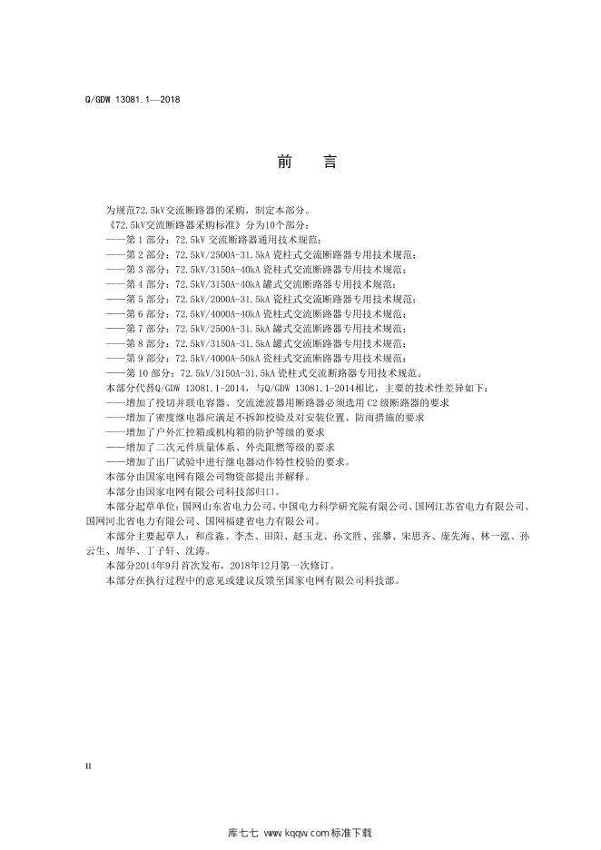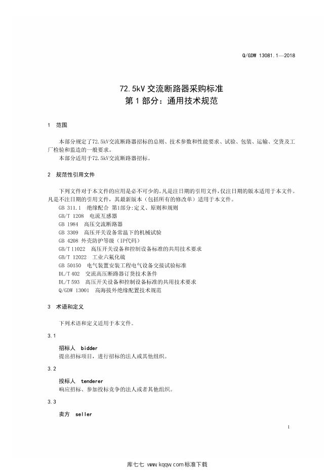 Q/GDW 13081.1-2018 72.5kV交流断路器采购标准 第1部分:通用技术规范