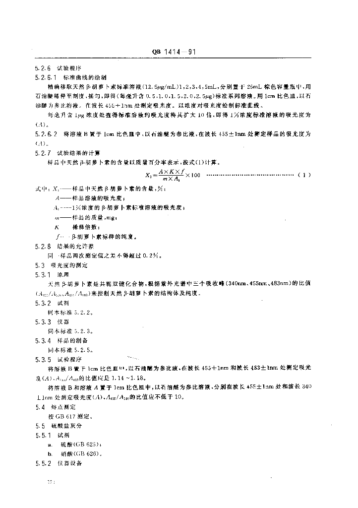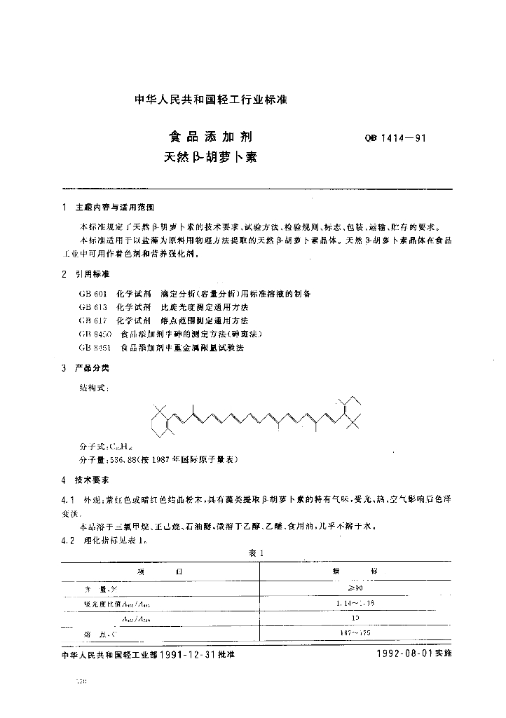 QB 1414-1991 食品添加剂天然β-胡萝卜素