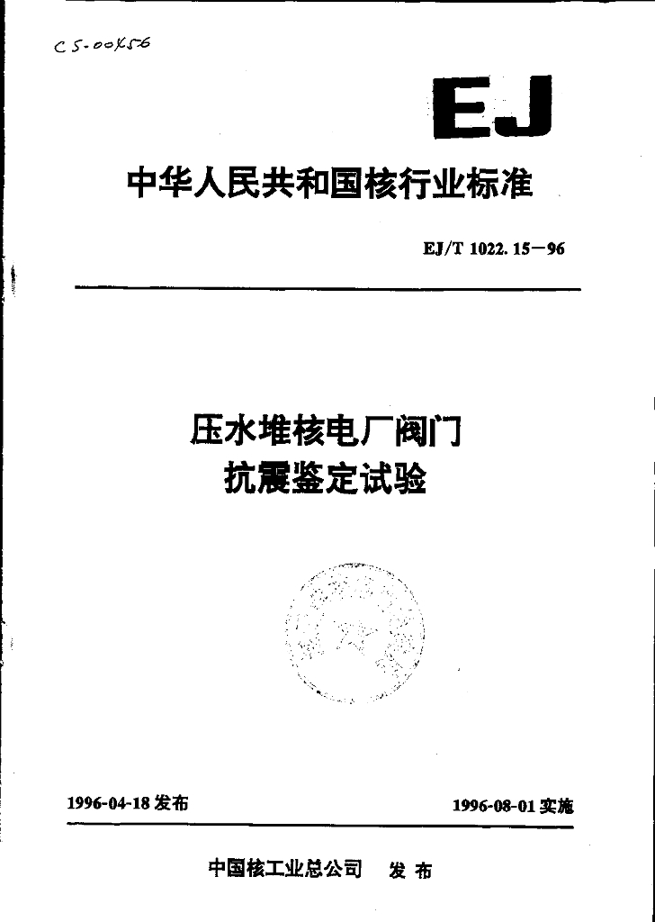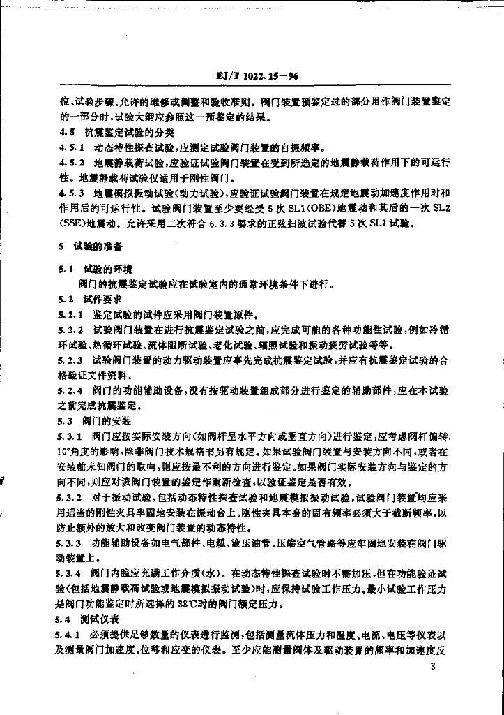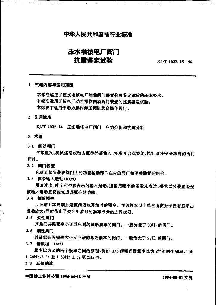 EJ/T 1022.15-1996 压水堆核电厂阀门 抗震鉴定试验