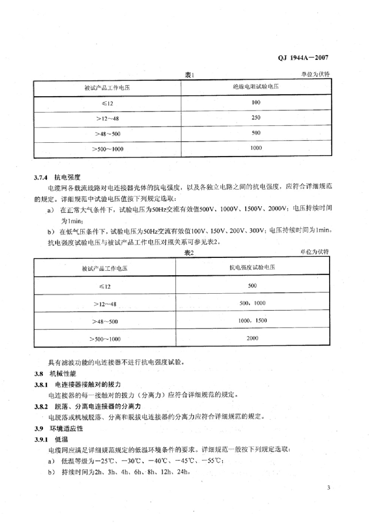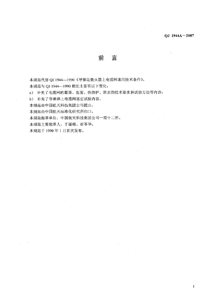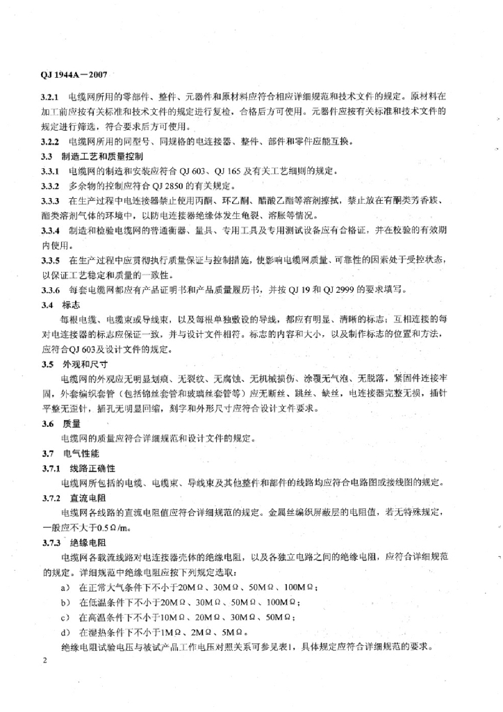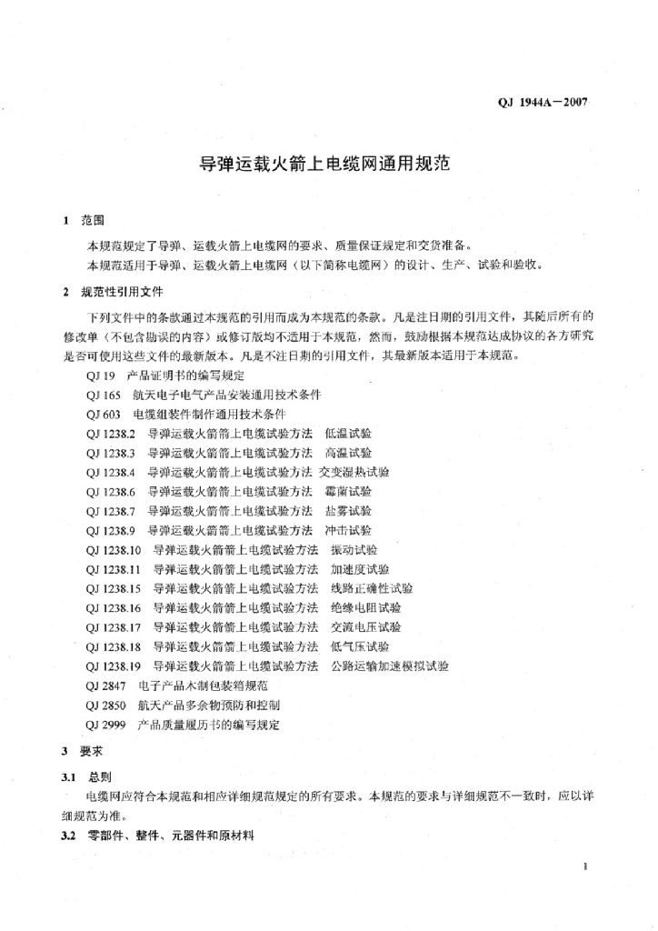 QJ 1944A-2007 导弹运载火箭上电缆网通用规范