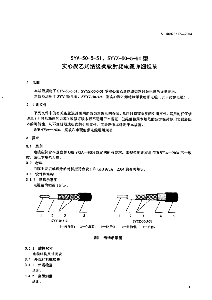 SJ 50973/17-2004 SYV-50-5-51,SYYZ-50-5-51 型实心聚乙烯绝缘柔软射频电缆详细规范