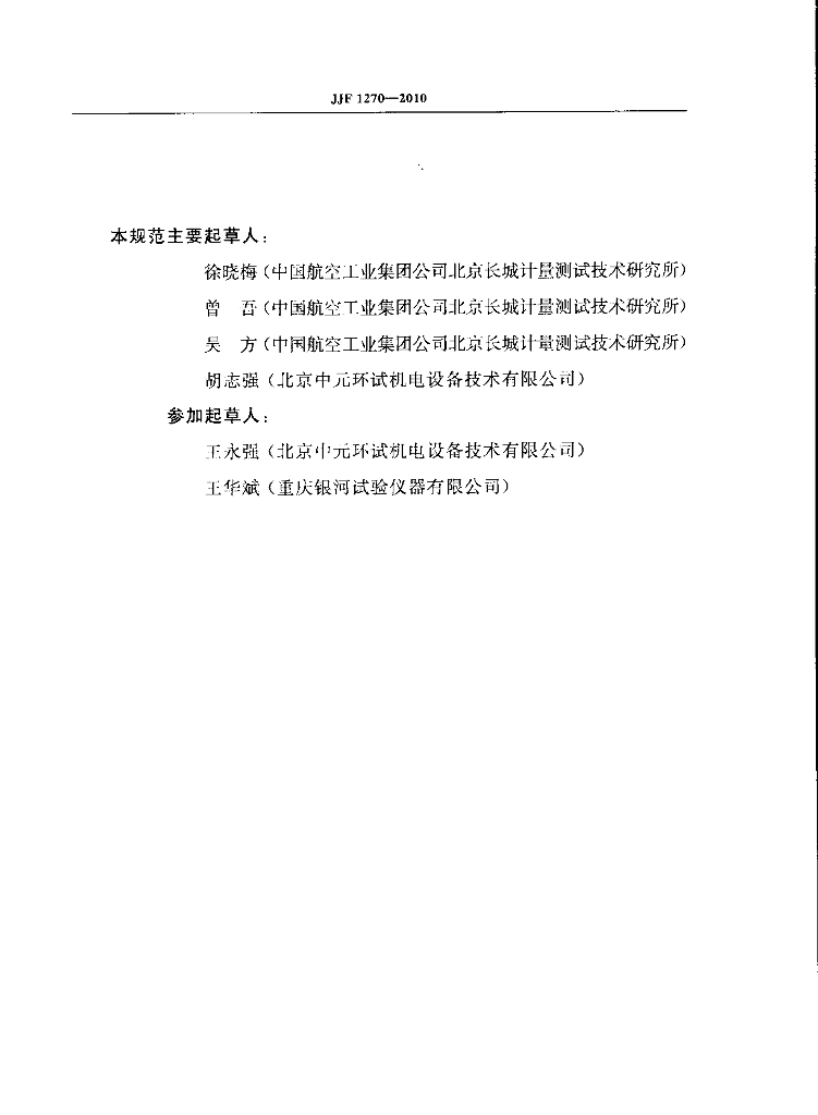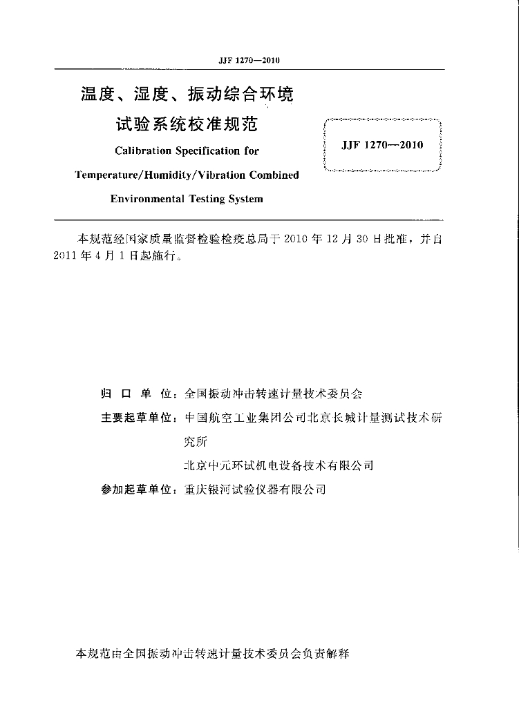 徐晓梅(中国航空工业集团公司北京长城计量测试技术研究所)、曾吾(中国航空工业集团公司北京长城计量测试技术研究所)、吴方(中国航空工业集团公司北京长城计量测试技术研究所)、胡志强(北京中元环试机电设备技术有限公司)、王永强(北京中元环试机电设备技术有限公司)、王华斌(重庆银河试验仪器有限公司)