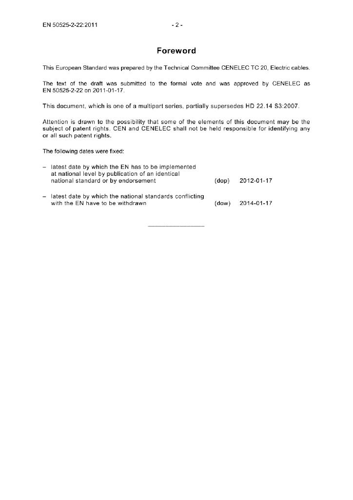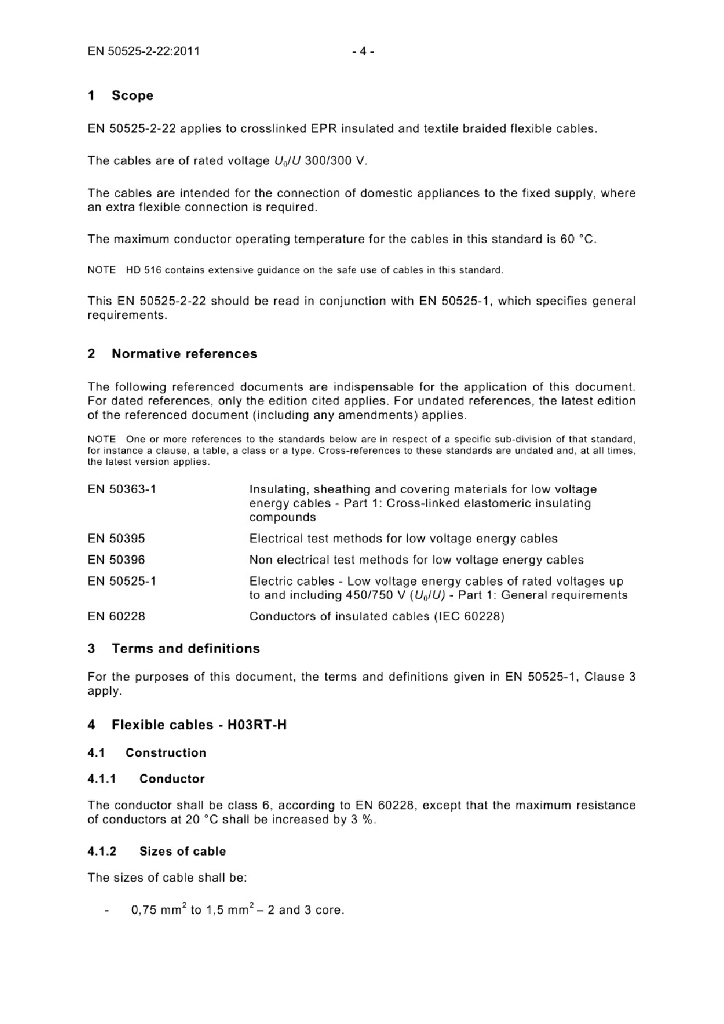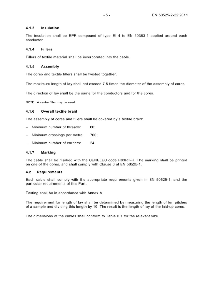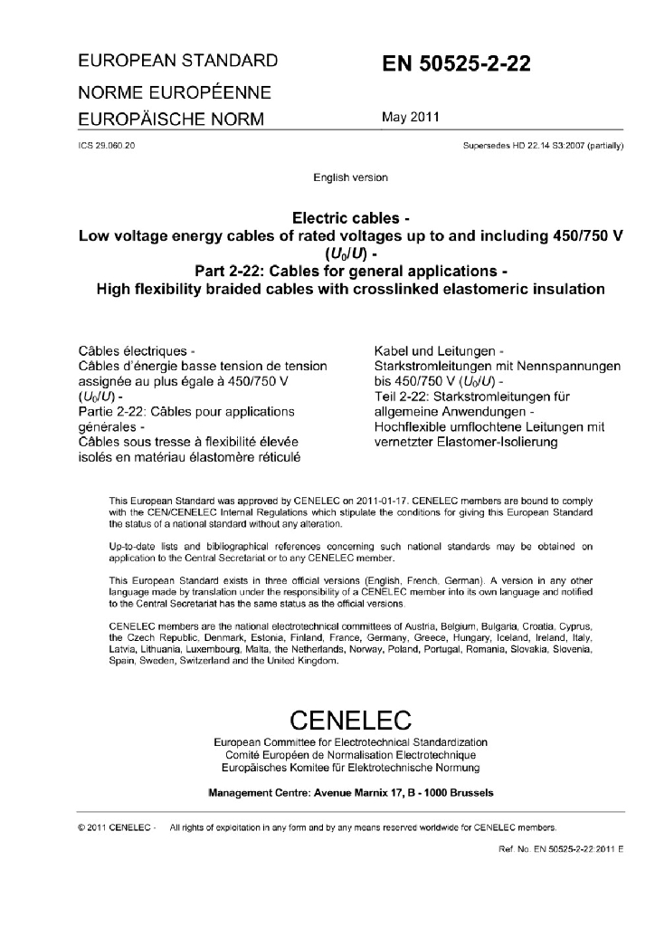 EN 50525-2-22:2011 额定电压450/750V及以下低压节能电缆 - 第2-22部分 通用电缆 - 带有高弹性编织层的交联弹性体绝缘电缆