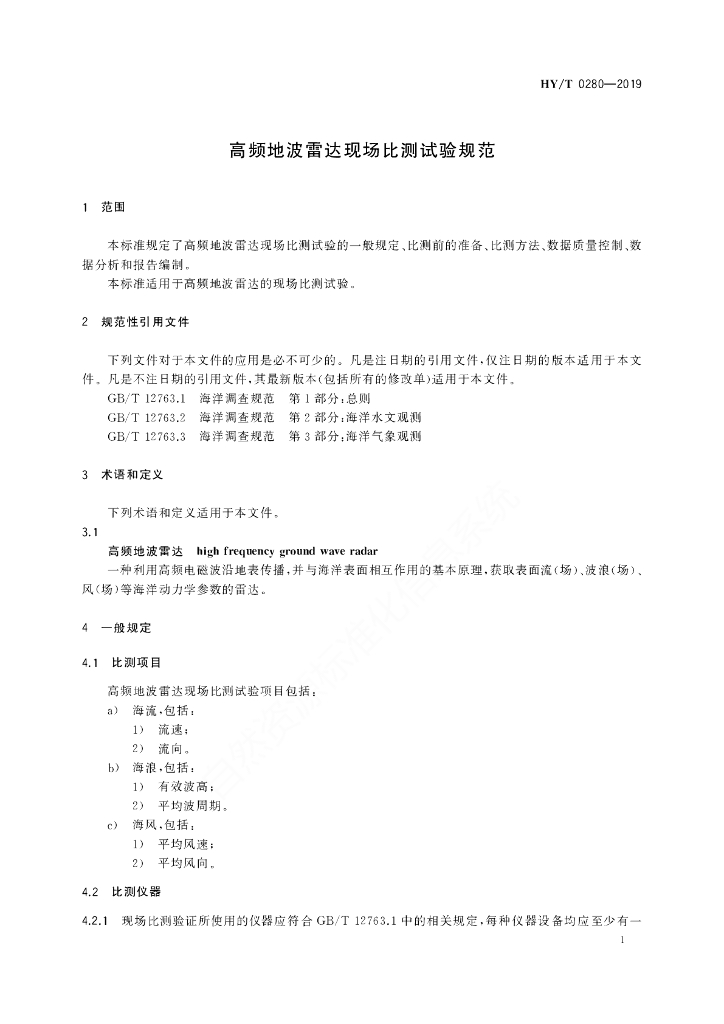 HY/T 0280-2019 高频地波雷达现场比测试验规范