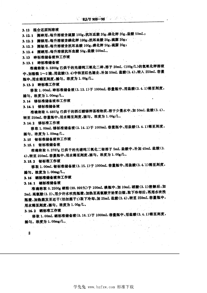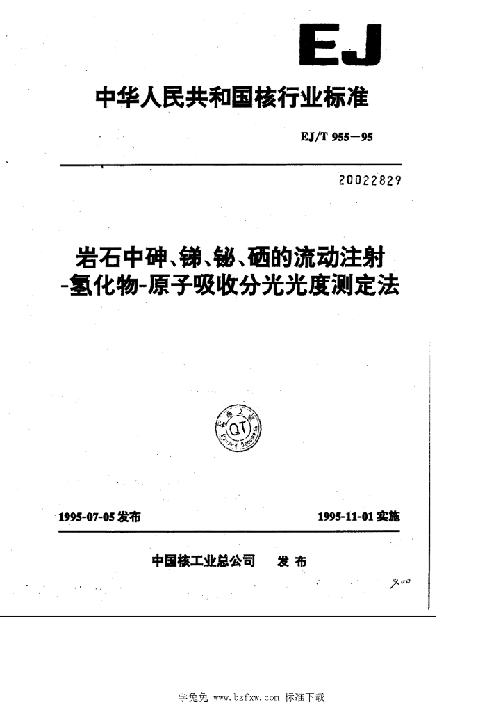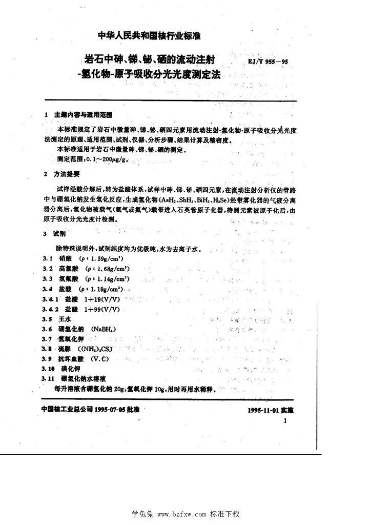 EJ/T 955-1995 岩石中呻、锑、铋、硒的流动注射 -氢化物-原子吸收分光光度测定法