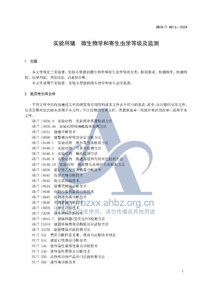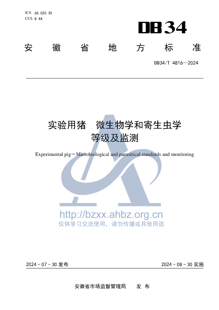DB34/T 4816-2024 实验用猪 微生物学和寄生虫学等级及监测