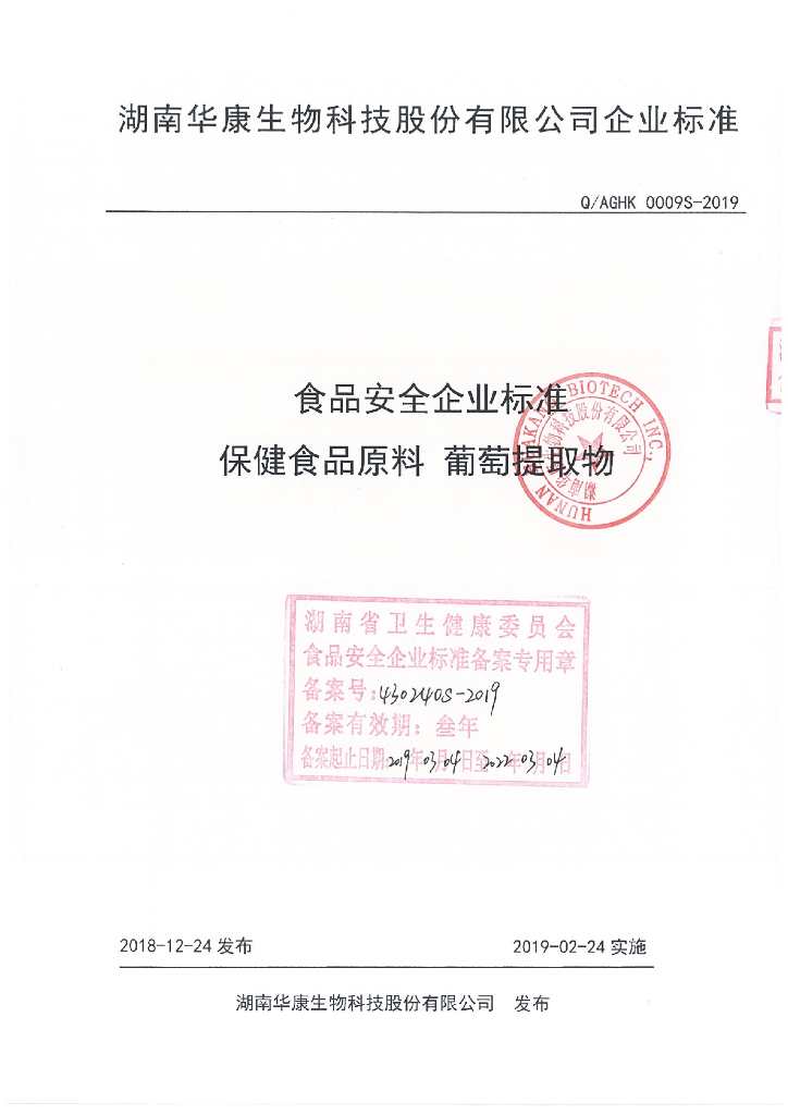 Q/AGHK 0009S-2019 保健食品原料 葡萄提取物